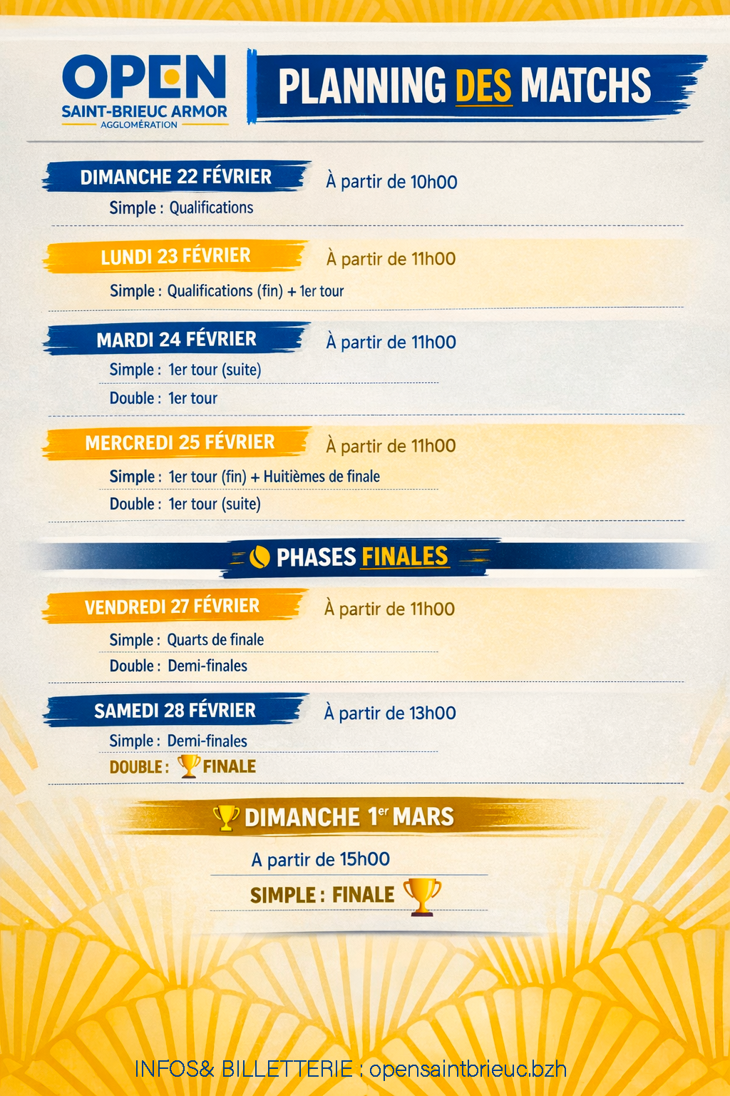 L’Open Saint-Brieuc Armor Agglomération dévoile son planning prévisionnel, marquant le compte à rebours avant le lancement de cette nouvelle édition du tournoi.